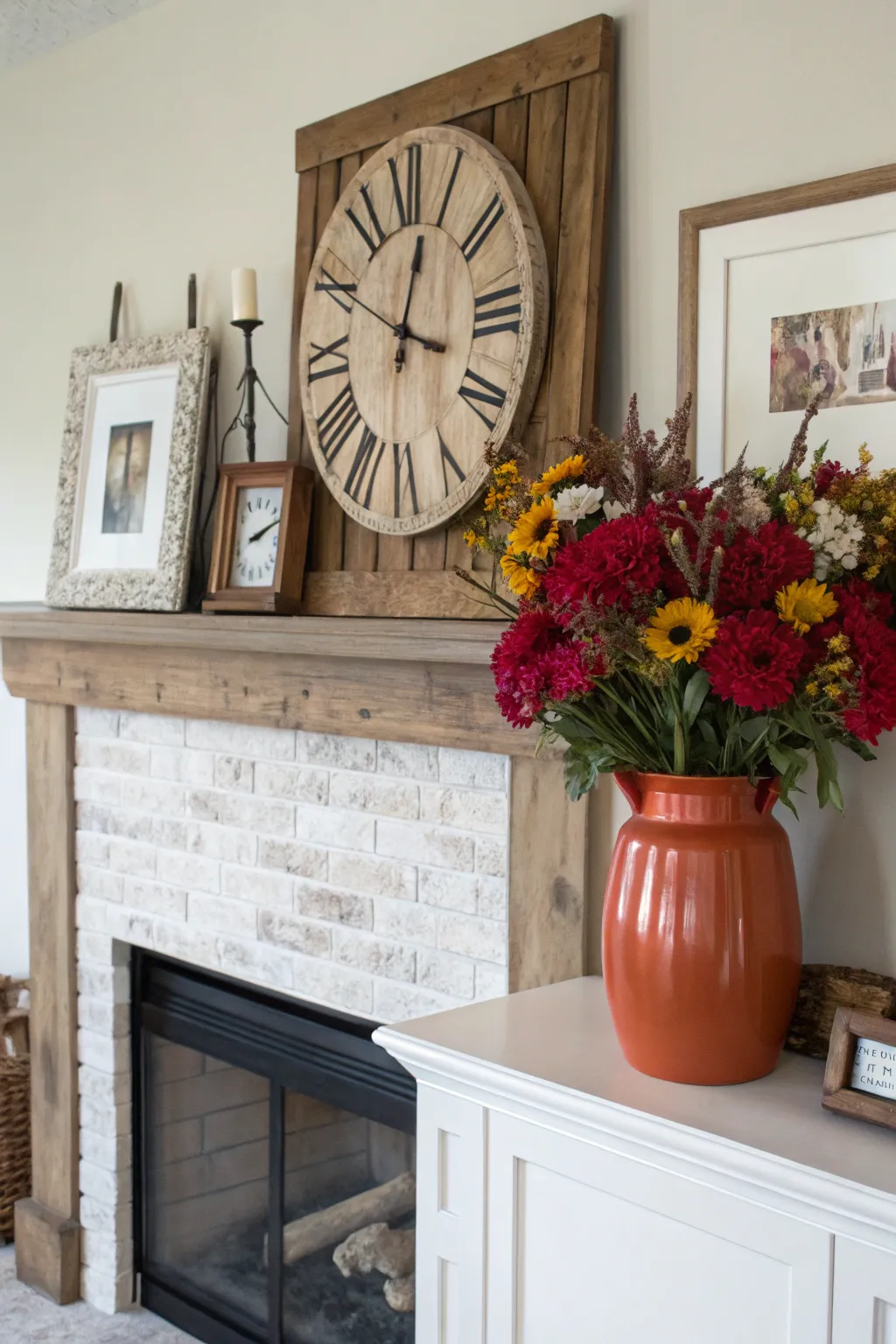Begin with a base of raw timber features, such as salvaged wooden supports or a countryside-style shelf. From my personal mantel projects, I’ve noticed that they immediately bring a cozy, farmhouse vibe and a sense of comfort.