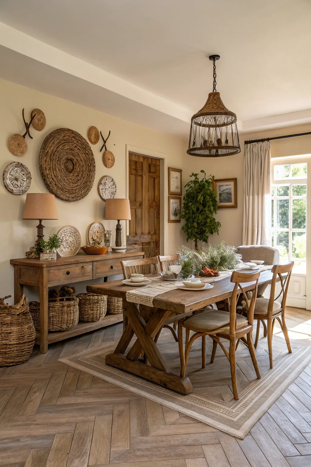 - Organic Woven Cane Container Set: Keep organized in style with charming woven containers that introduce texture to your muted dining area.