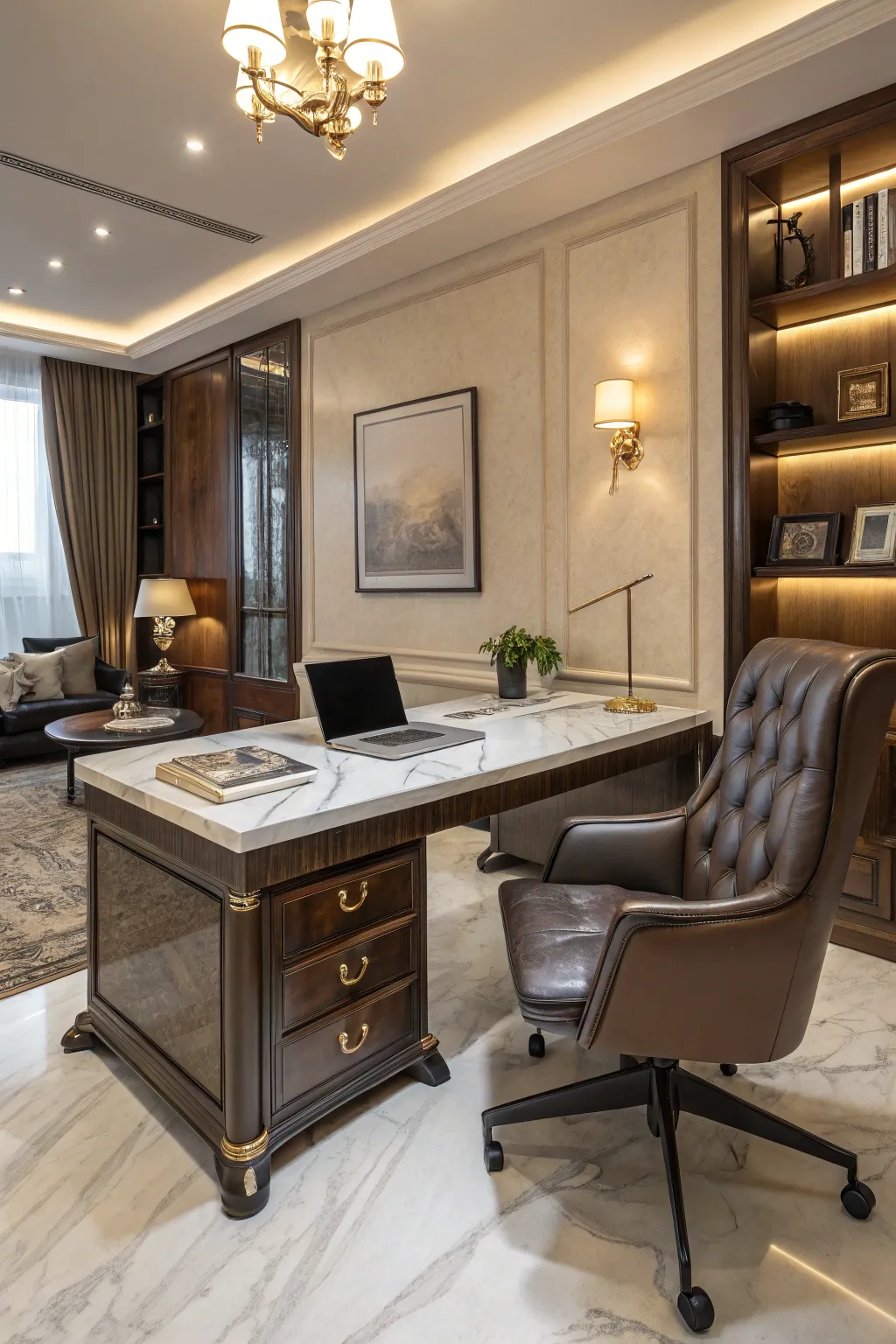 Incorporating superior elements like polished stone and fine leather inside your home office may immediately improve the space. I am fascinated by how a polished stone desk combined with a fine leather chair introduces a sense of luxury and sophistication.