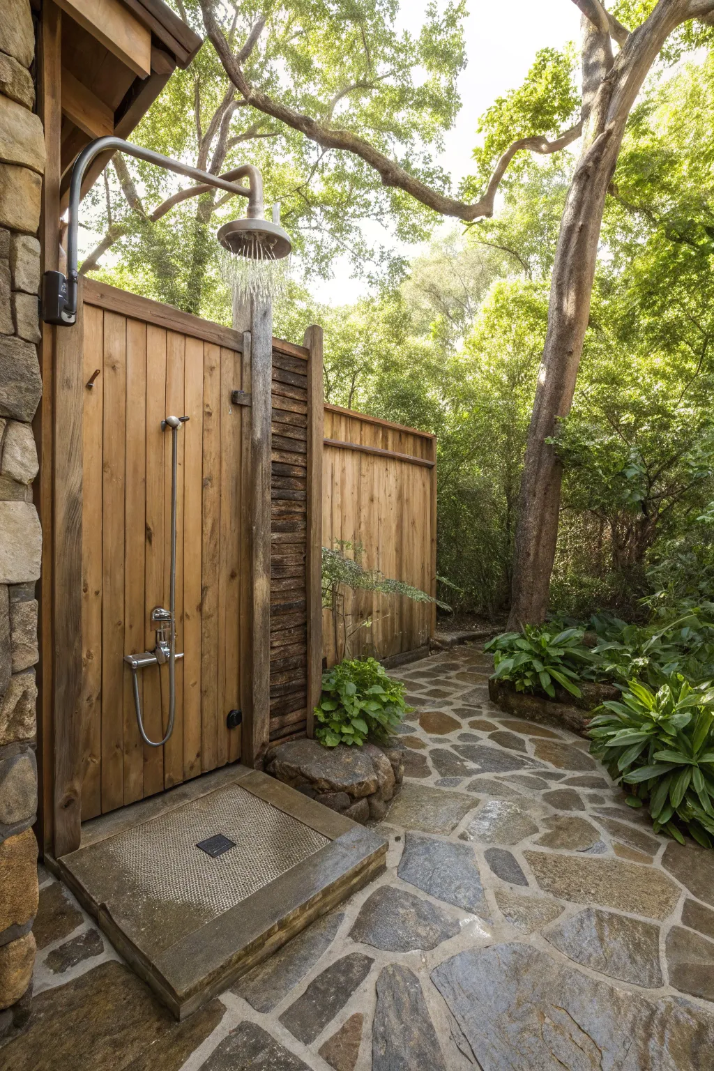 - Rock Shower Surface: Amplify the earthy feel of your outdoor shower with a sturdy, natural rock surface underfoot.