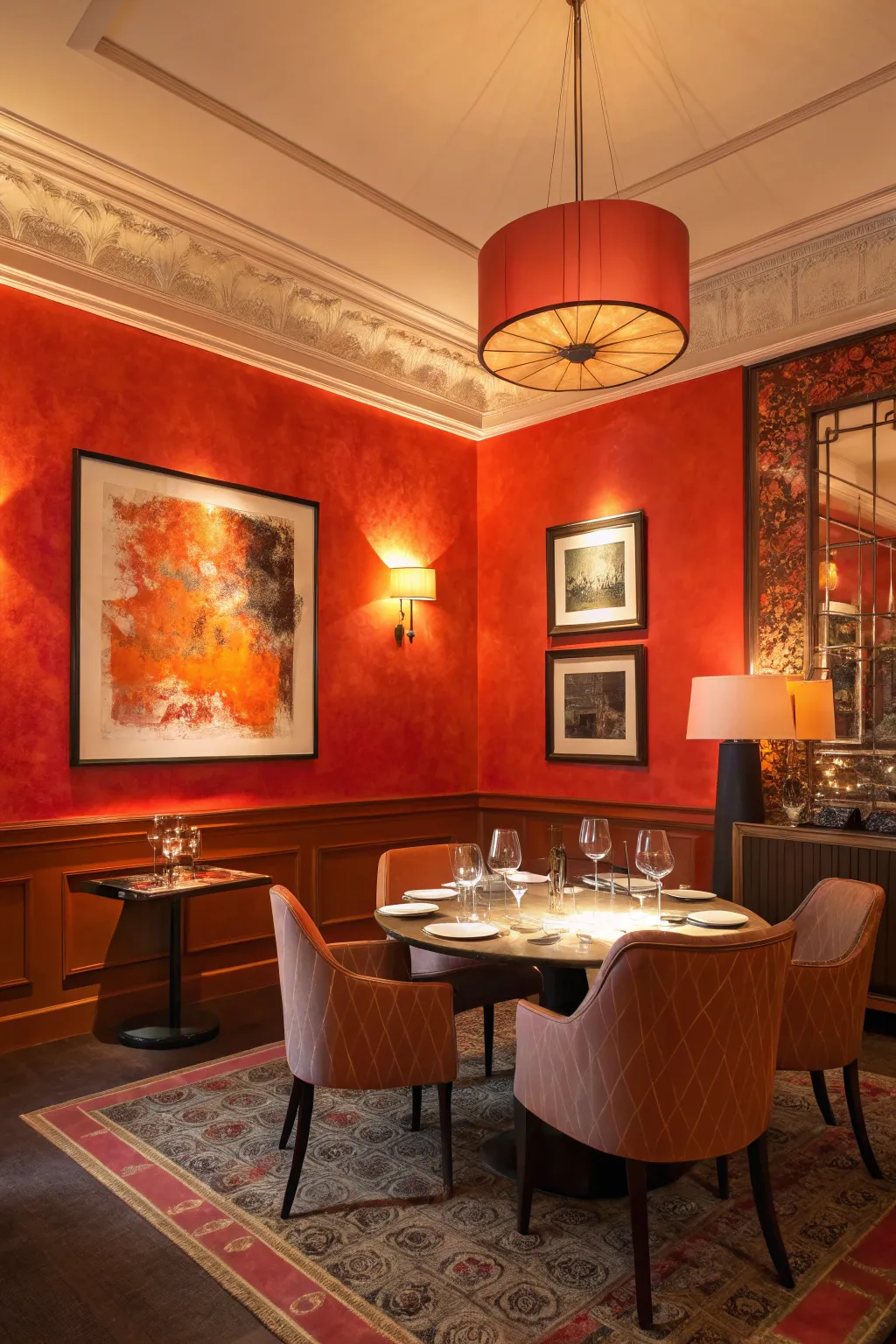 Light up your dining area using vivid reds and oranges for a lively and energetic vibe. These hues remind me of dynamic sunsets and are excellent for triggering interesting conversations.