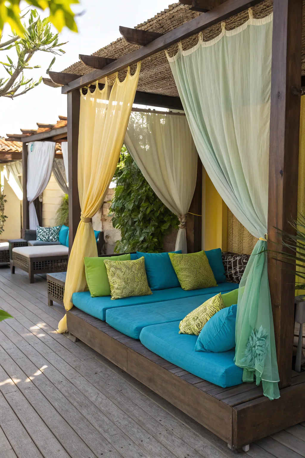 Use vibrant outdoor fabrics for cushions and curtains. From my experience, they add comfort and energy to any patio setting.