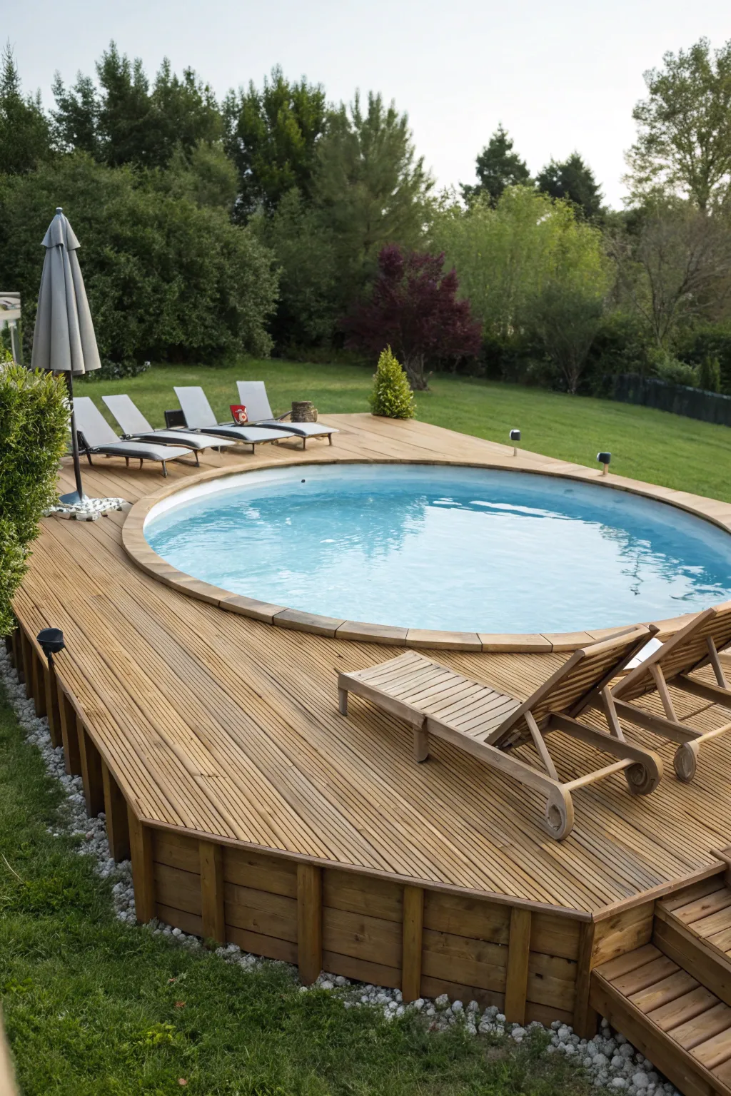 Wrapping your pool with a basic wood-style deck can significantly enhance its charm without excessive spending. I chose composite decking for my project, which offers a blend of natural appeal and affordability.