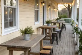 Begin with natural wood tones for your porch’s decking and handrails to establish a timeless, country-style base. I’ve always appreciated how timber adds coziness and a classic touch to any outside area.