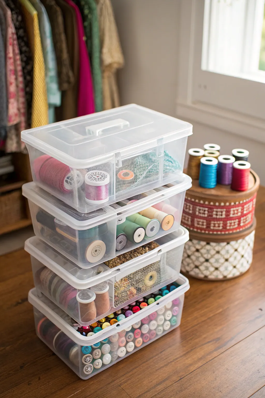 - See-Through Fabric Containers: Keep your fabric organized by color using transparent bins for effortless access and a neat presentation.