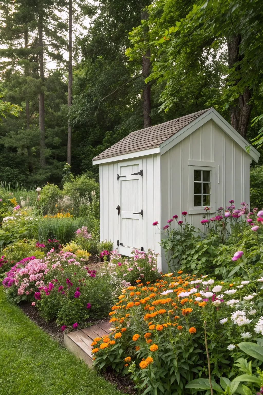 A sharp white shed offers a striking contrast against the lush garden, bringing a fresh and modern touch. It’s like a blank slate, ready for your garden’s colors to shine.