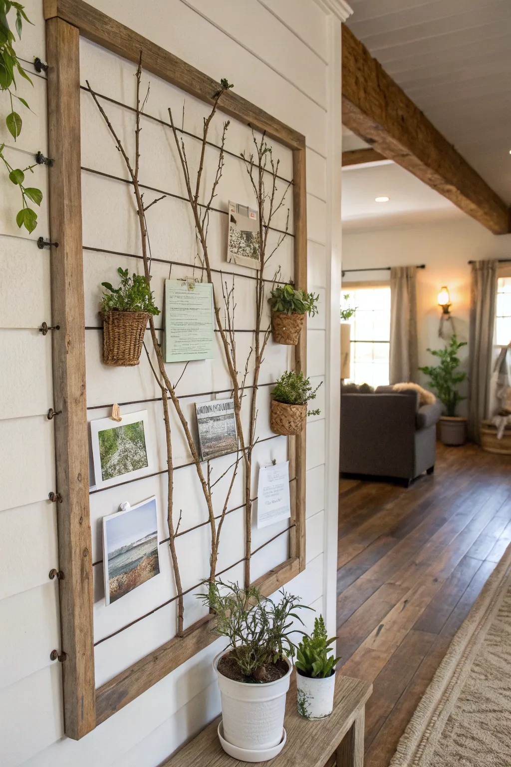 Bring the outdoors inside by adorning your shiplap board with natural finds like twigs and small potted plants. It’s a refreshing way to add a touch of nature to your decor.