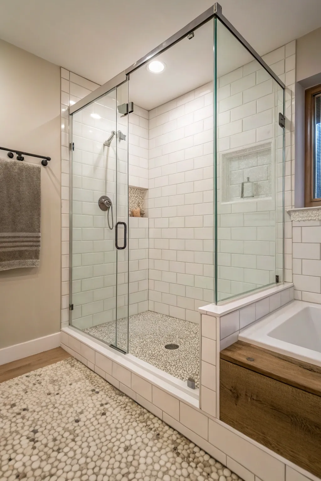 - Pebble Tile Mats: Add organic charm to your shower curb with elegant pebble tiles.