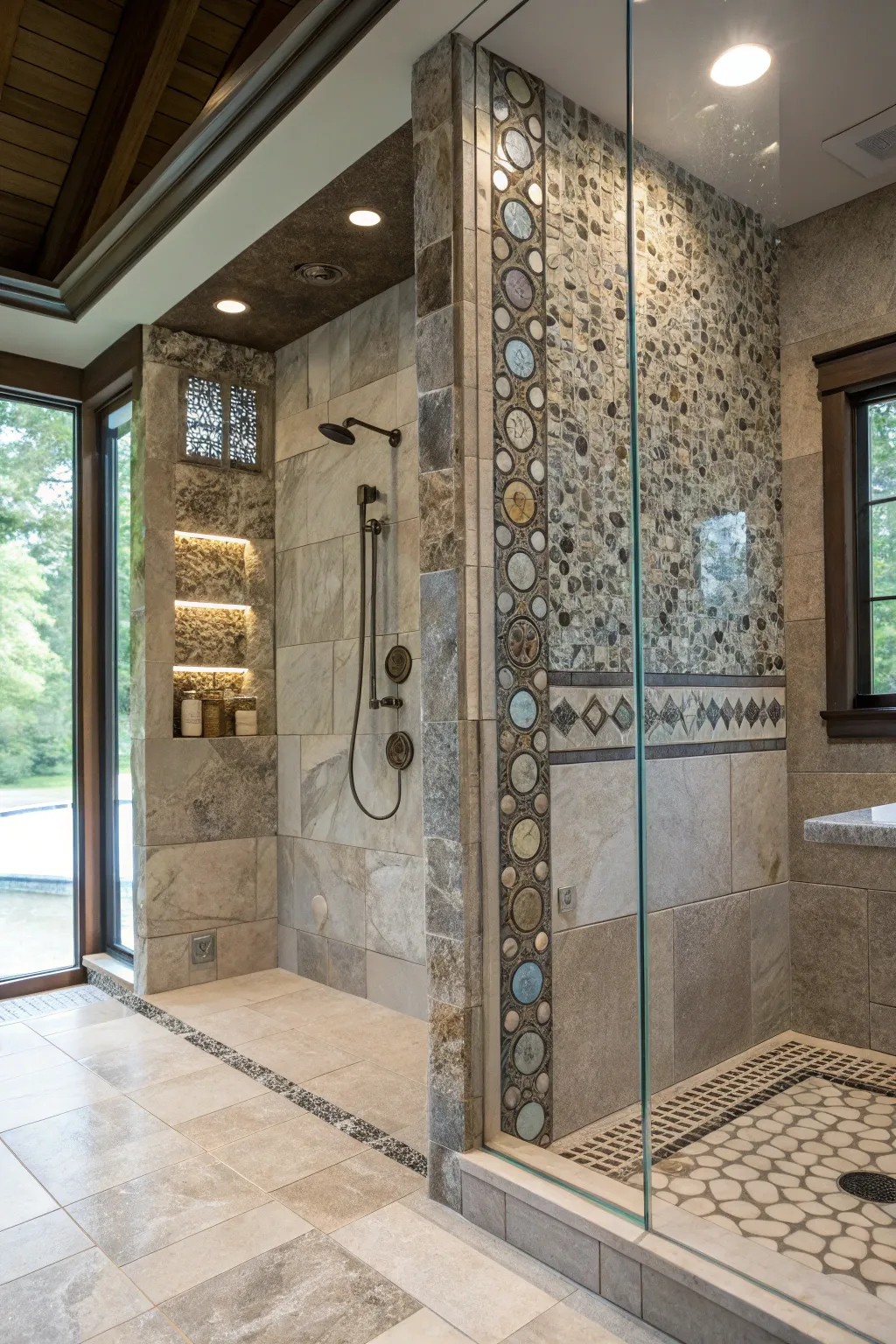 Introduce abstract patterns to add a contemporary and artistic charm to your shower. This is a strategy I use to engage the eye and spark creativity.
