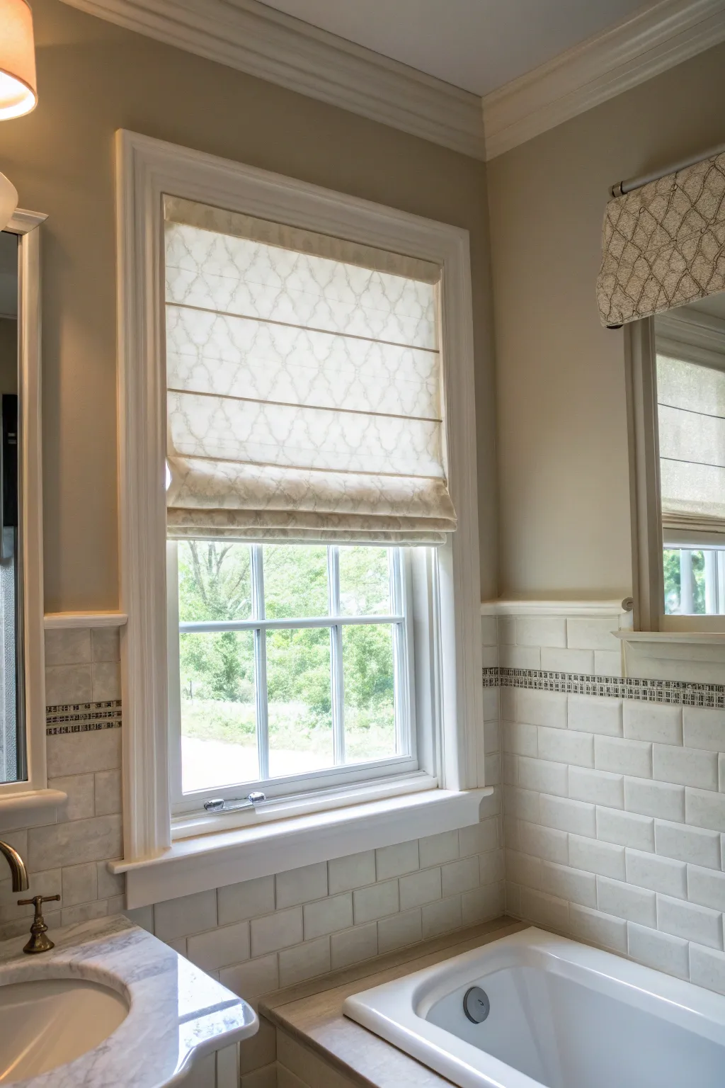 Choose folded shades for a tailored, elegant look that matches your design preferences. They’re a useful and stylish option for any compact bathroom.