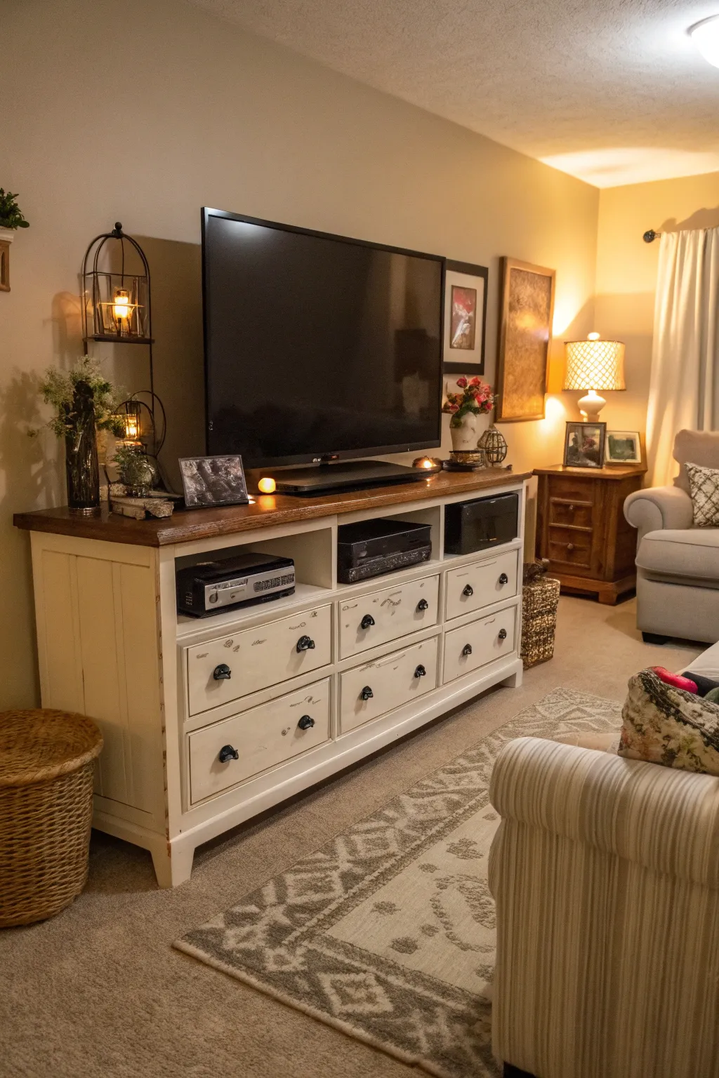 Think creatively about furniture. A chest of drawers can also function as a media stand, providing extra space for electronics and other items.