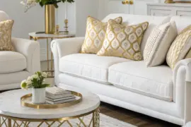 Use matching chairs and ottomans to make a complete seating area around your sofa. I’ve seen this setup offers flexibility and comfort for different activities and get-togethers.