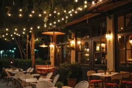 Suspend lights across your outdoor space for a magical nighttime ambiance. It makes me think of quaint European cafes – charming and welcoming.