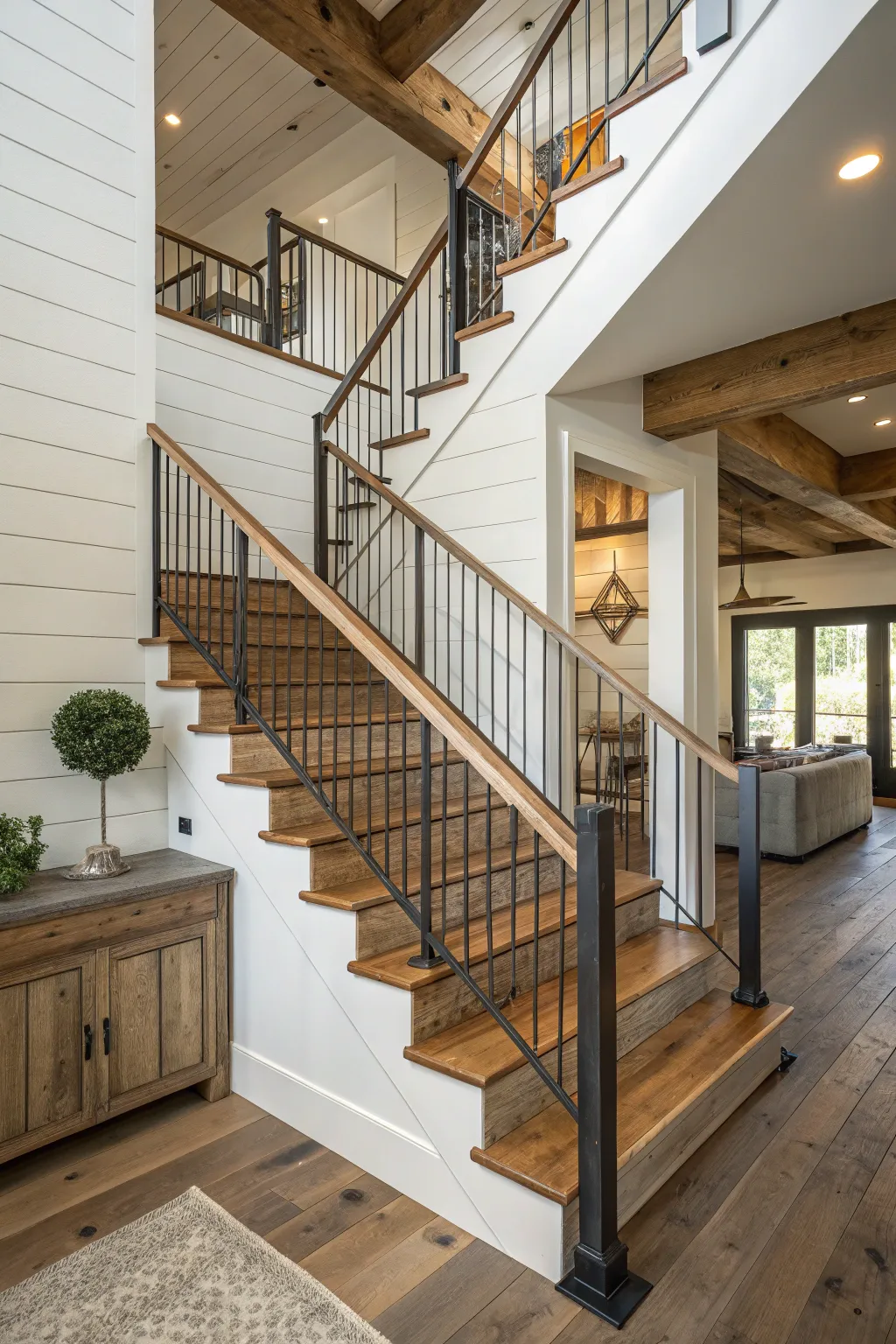 Uniting wood with elements like metal or glass introduces a polished, modern element to your farmhouse staircase. I’ve observed that this combination sparks an exciting contrast that elevates both the rustic and contemporary features.