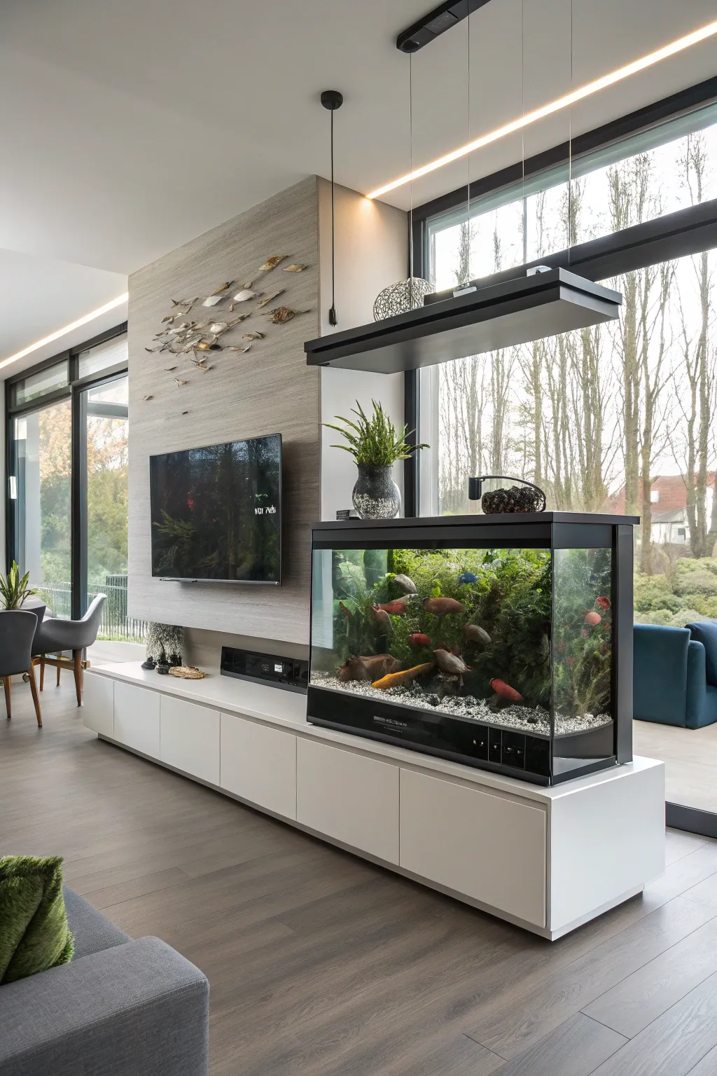 Divide your space creatively through an aquarium partition wall that doubles as a room divider. I added one to my open-plan apartment, and it gracefully separated the dining and living areas.