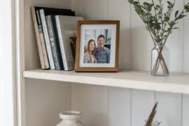 - Metal and Wood Shelving Unit: Combine elegance and functionality with a sturdy shelving unit, perfect for displaying albums and decor.