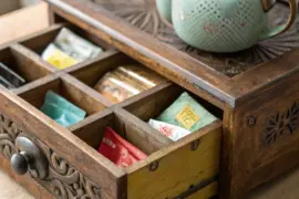 • Rustic Wooden Boxes: Add rustic charm to your kitchen using adaptable, long-lasting wooden boxes for stylish glass storage.