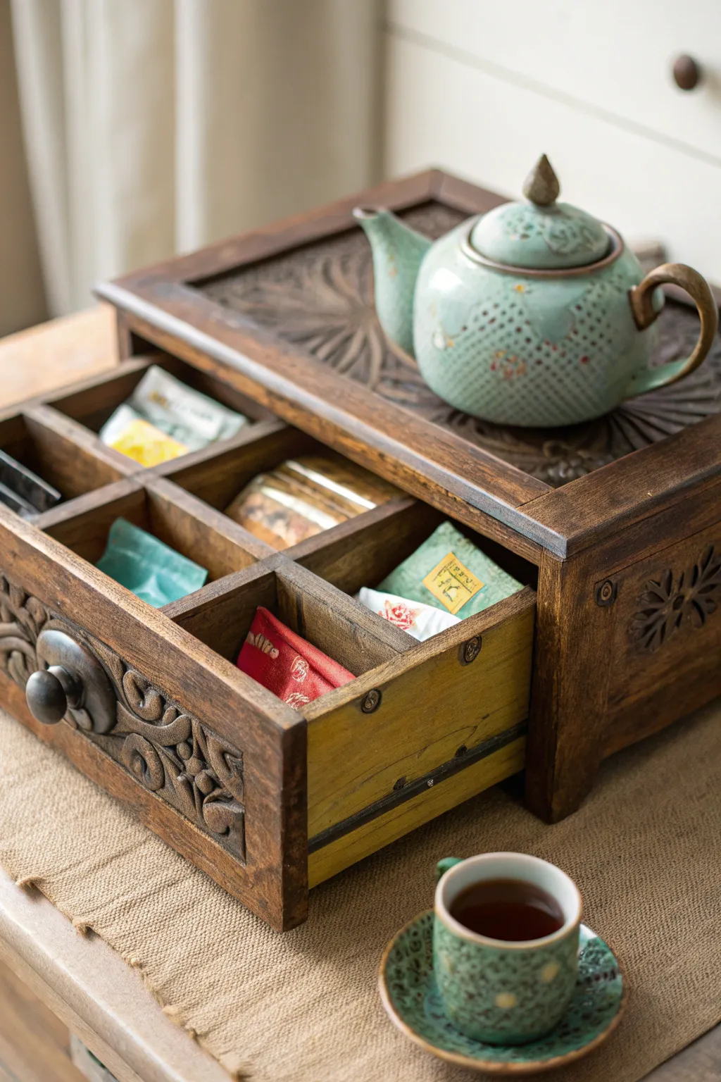 • Trendy Tea Chest with Sections: Arrange your preferred teas with elegance in a chic chest that enriches your countertop’s appeal.