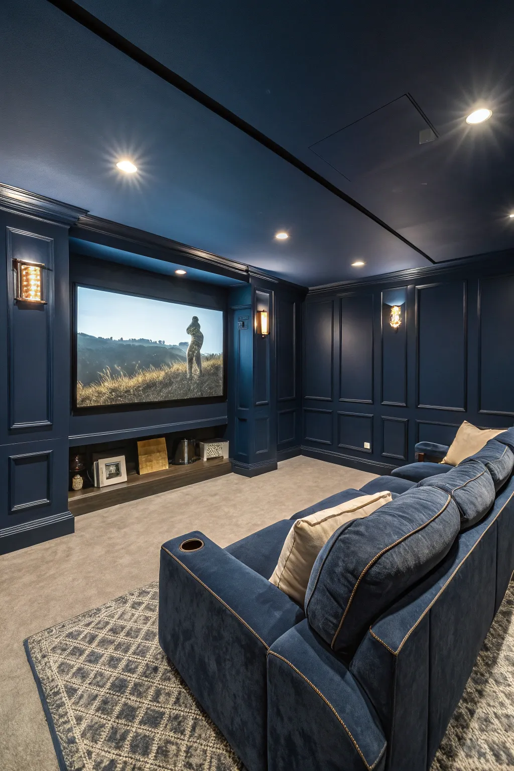 - Navy Velvet Drapes: Install navy velvet drapes to establish a plush, private theater ambiance.