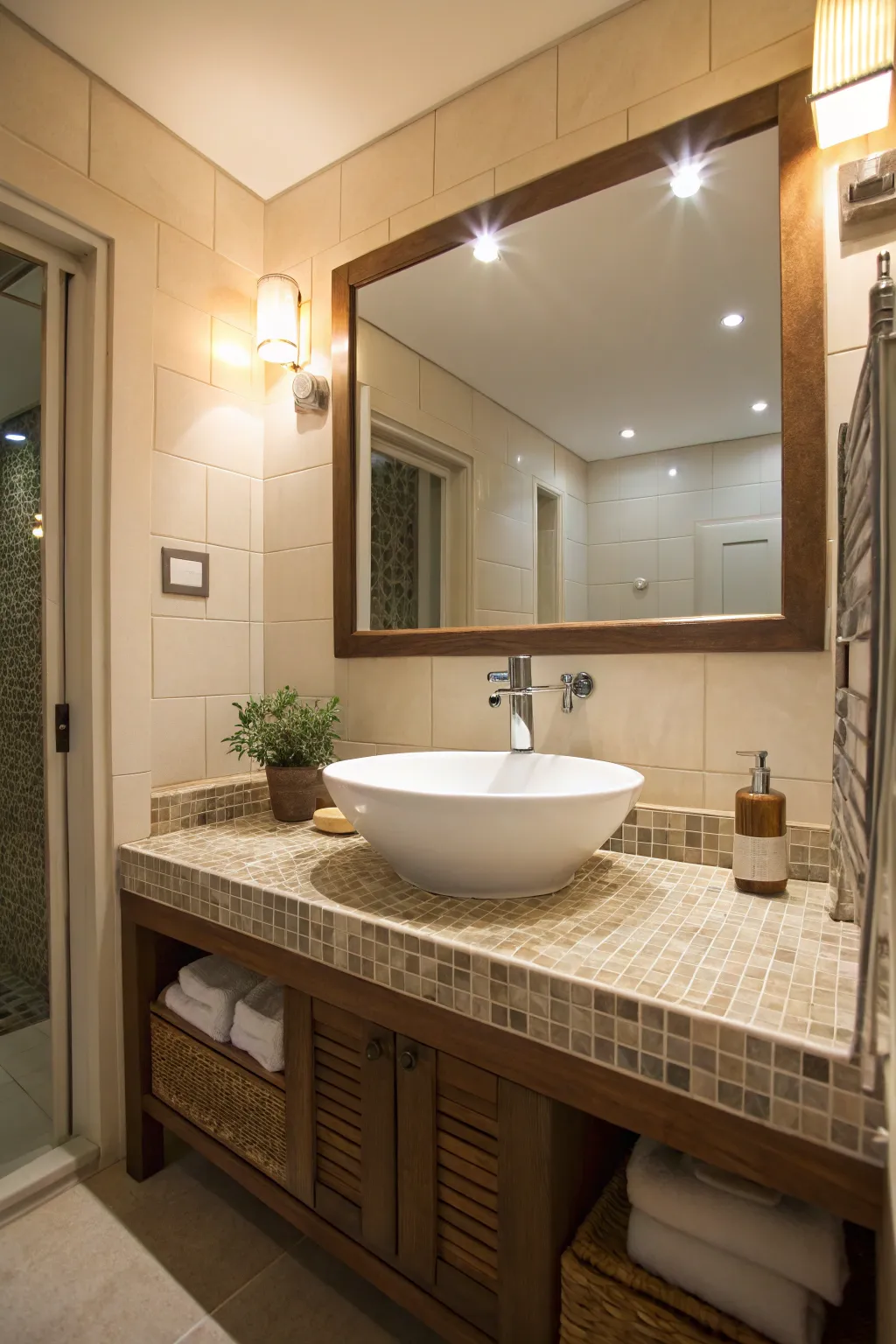 Combining a tiled countertop with an above-counter basin is an ideal pairing. The elevated basin introduces a dash of refinement, and I’ve come to appreciate how it elevates daily tasks.