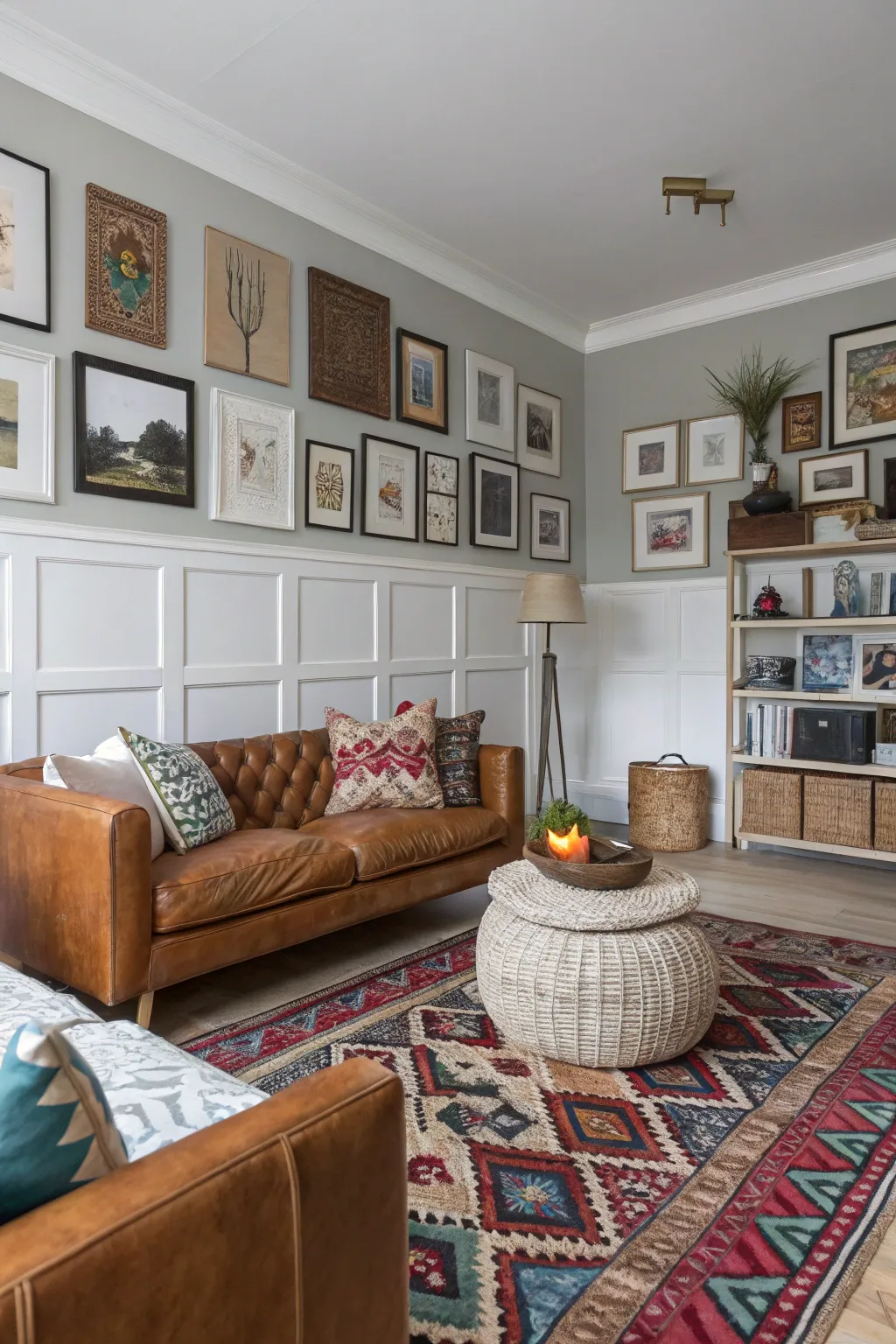A living space showcasing blended wainscoting styles for an eclectic aesthetic.