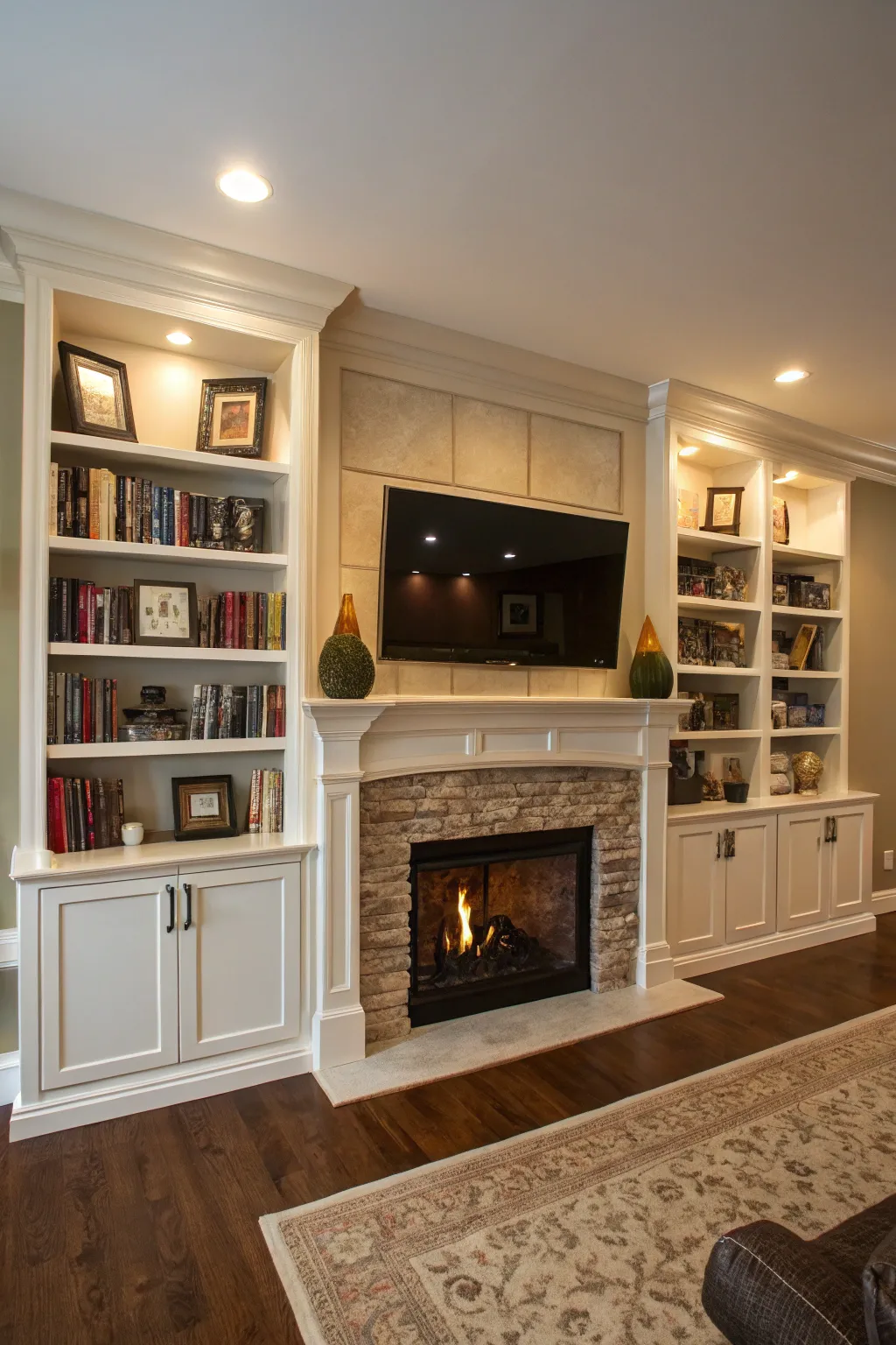Family room showcasing symmetrical built-ins surrounding a fireplace wall and TV.