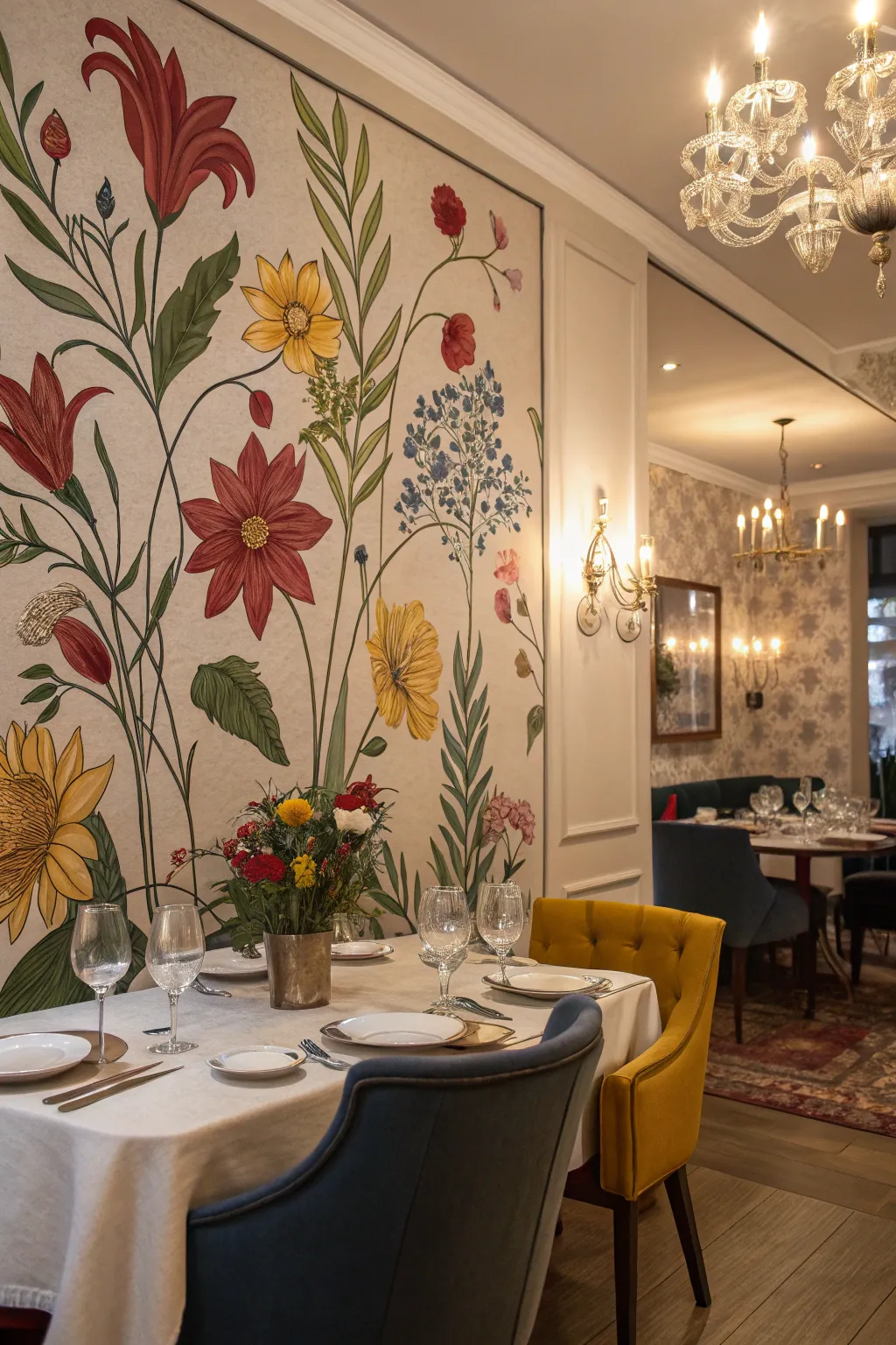 A botanical-themed mural can bring the garden inside. My living area now feels like a lush, green retreat thanks to the detailed plant illustrations.