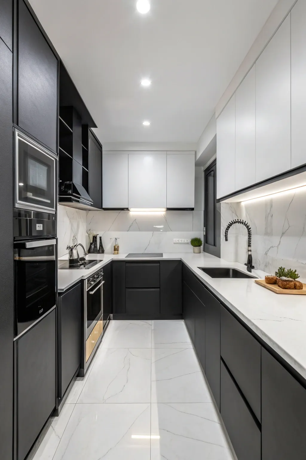 Incorporate refined contemporary appliances crafted from stainless steel to harmonize with the black and white design. These introduce an element of sophistication while sustaining practicality.