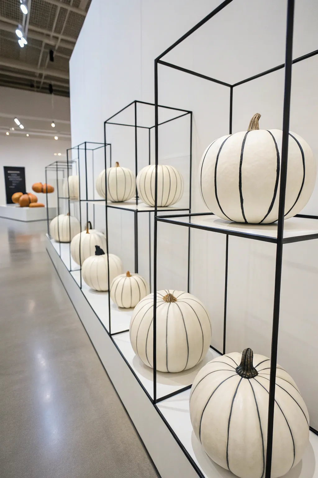 Establish a striking contrast by painting dark stripes or geometric patterns onto your white pumpkins. This daring style invariably captivates visitors.
